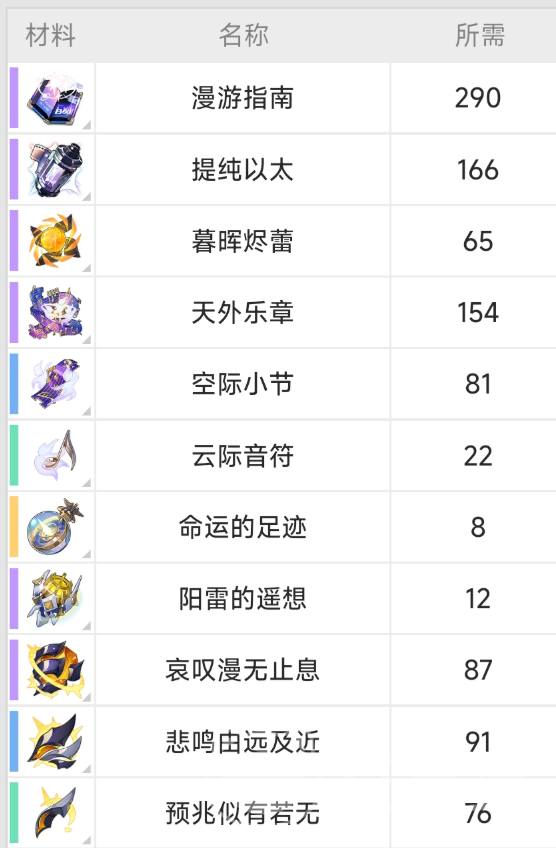 角色升级消耗材料,升到满级一定需要290本指南,65个烬蕾,15个哀叹止息,15个悲鸣,15个预兆,同时还需要88.8万的信用点数。行迹养成消耗部分,需要139个天外乐章、69空际小节、18云际音符、8命运的足迹、12阳雷的遥想、58个哀叹、56个悲鸣、41个预兆,还有300万信用点。