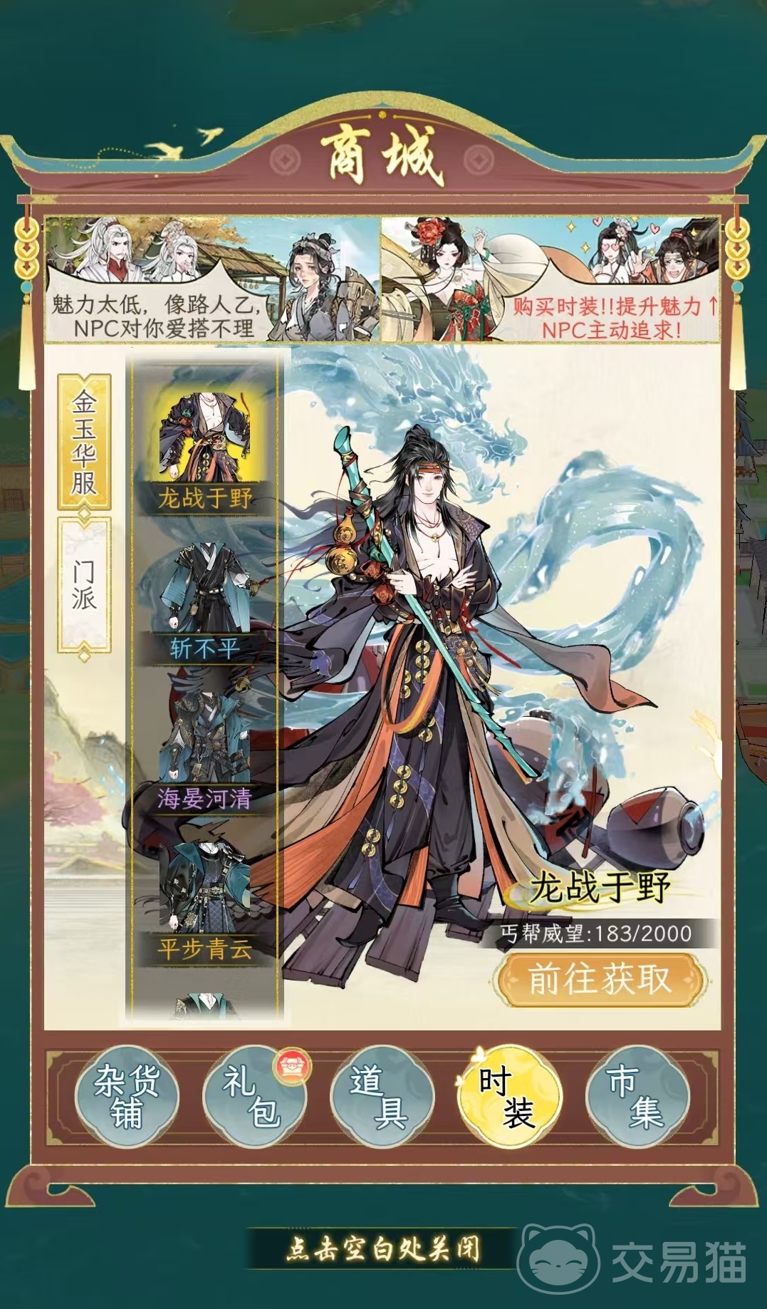 大家想要获得时装,最主要的途径就是在商城中直接购买,点击商城之后直接切换到时装,就可以看到当前的绝大多数游戏类的时装分类。这里面又分为金玉华服和门派这两大类。门派非常简单,就是属于各个江湖门派的时装,而金玉华服则偏向于华丽一些。这两种不同的时装类型,获取方式也不一样,有些直接在游戏中就可以获得,而有些的必须去氪金。