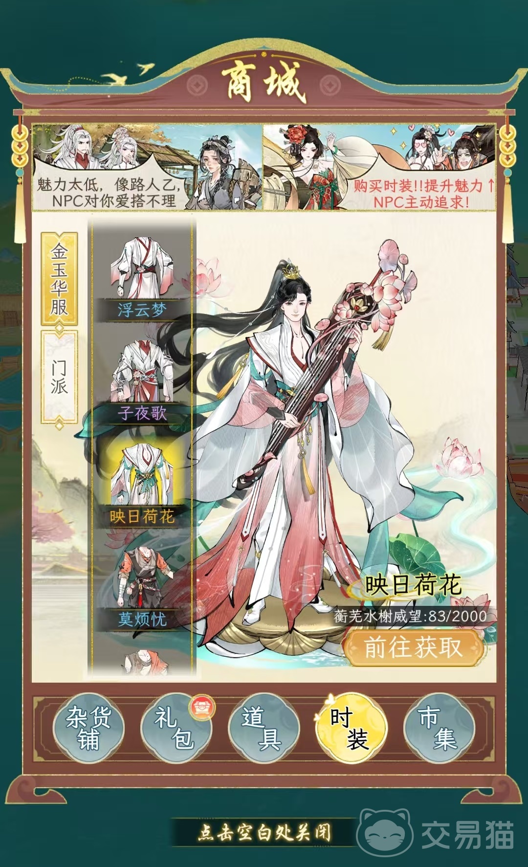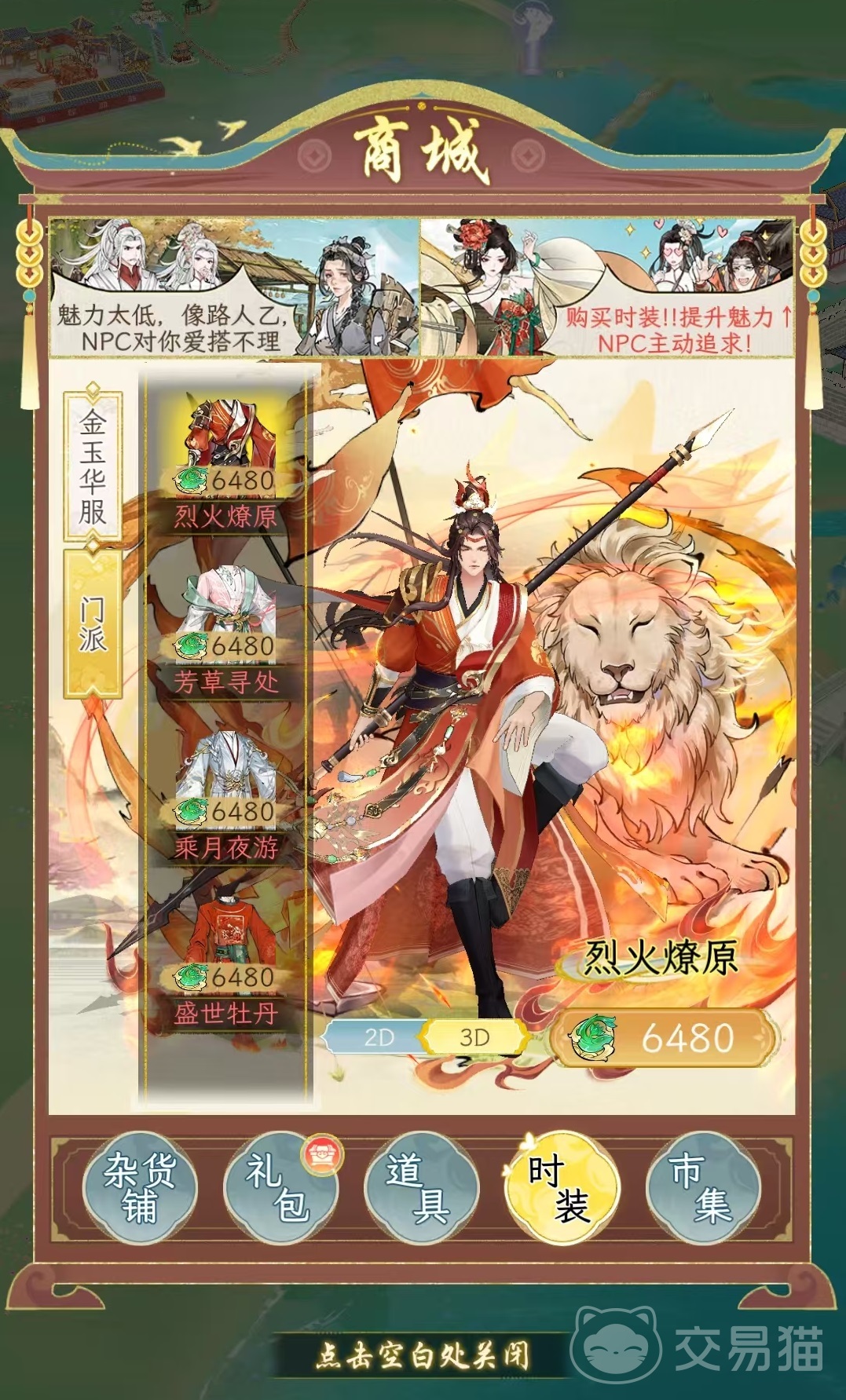 其中门派时装设计比较简约,主要通过加入各种门派之后才能得到,例如映日荷花,就是在蘅芜水榭达到2000声望之后获得,龙战于野是丐帮威望达到2000之后得到,还有平步青云等各个门派的时装,在这里都能得到,是属于刷威望的主要动力。其他还有一些比较普通的门派时装,只要加入之后就能自动开启。相对应的金玉华服就需要大家付出一定的代价。金玉华服主要包括烈火燎原、芳草寻处、乘月夜游、盛世牡丹这四大类。每一种都需要消耗6480点金玉才能拿下,按照充值时的比例,6元可以购买60点金玉,那么就相当于648元才能拿下一件时装,所以非常氪金,平民玩家可以直接忽略。