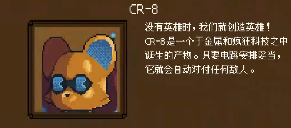 寄居蟹“波切特”则是需要向第三区域“沼泽集市”中随机刷新的贝壳商人支付三百金币来解锁,解锁起来相对比较简单的一个角色。而且寄居蟹拥有模块化背包,可以通过装备不同贝壳获得对应技能。比如"巨岩贝壳"可以获得等同护甲值的反伤、"珊瑚贝壳"每回合能恢复相邻友军的生命值。这个角色需要玩家具备优秀的经济运营能力与装备适配思维,属于高上限的策略型角色。因此大家注意带好充足的金币进入沼泽集市。如果金币不够商人消失需要重新刷出来。然后是机器人“CR-8”。需要在废弃工厂完成前置任务,然后在3-2弄到电路核心。随后在工厂底层4-4激活核心开启隐藏关。击败废铁君王后自动加入。