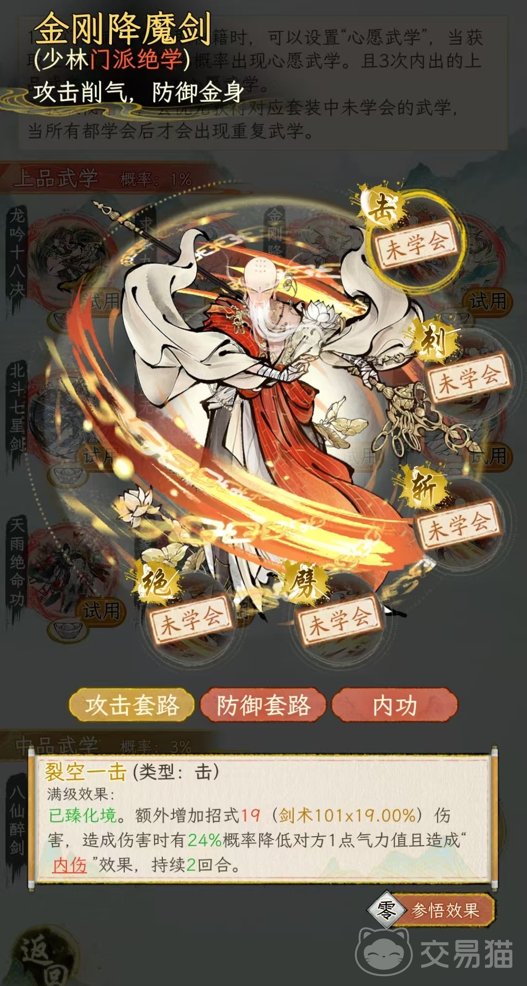 根据目前测试中的情况,位于t0层次的武学主要有两个分别是少林门派的绝学金刚降魔剑和峨眉门派的绝学越女剑法,这两个目前处于断崖式领先的地位。首先是金刚降魔剑,它的攻击套路是造成伤害时有几率降低对方1点气力值,且造成内伤效果。不同的招式触发降低气力值的几率有所区别,如果是绝招三入地狱,那么有100%的几率降低对方气力值,造成的内伤效果能持续三回合。对方被内伤之后无法蓄力,无法触发加气力值的效果,可以说很好地限制了对方发挥。