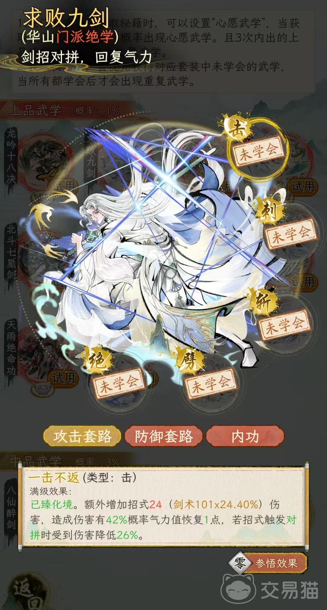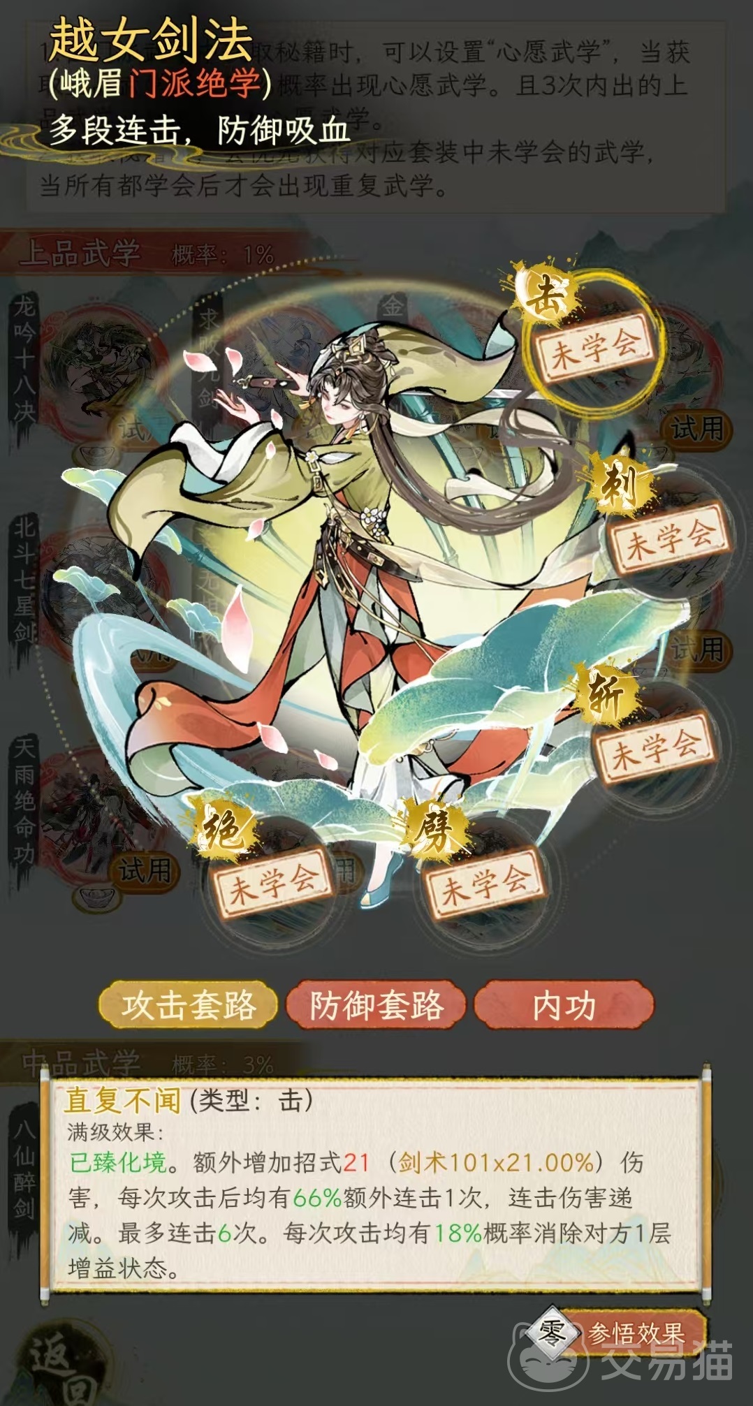 金刚降魔剑的防御套路,特点是防御成功时有几率给自身附加金身状态。在此状态下受到攻击只减少1点气血,生效1次,是非常强势的防御型套路,所以说金刚降魔剑真正做到了有攻有防非常全面。越女剑法的特点是具有多段连击效果,有吸血的能力。攻击套路是每次攻击后都有几率触发额外的连击,连击伤害递减。根据不同招式,最多连接次数有所不同,例如绝式百无禁忌,最多能连击8次,另外每次攻击还有几率消除对方1层增益状态。防御套路则是在防御成功后为自身附加吸血。