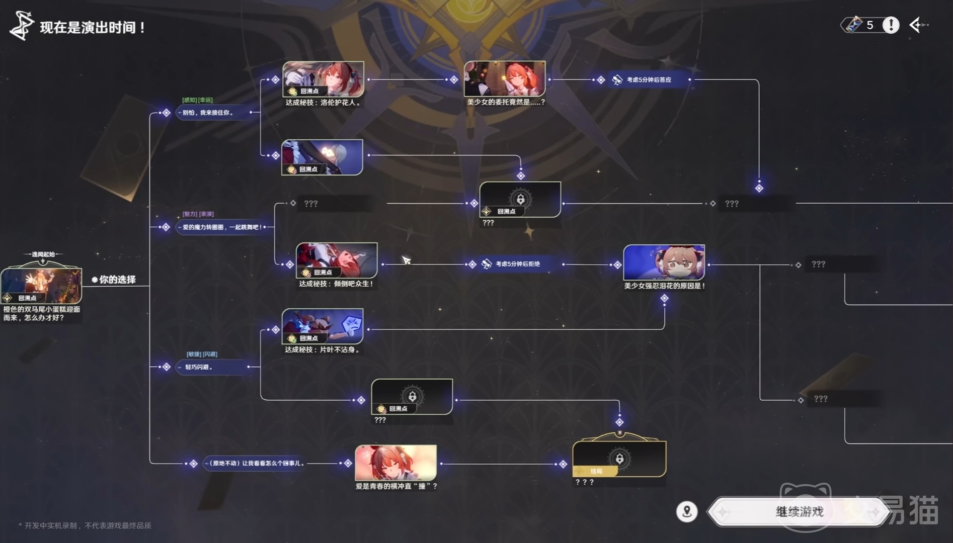 在你选择结果的时候,游戏还会给出九宫格形式的选项,代表不同的态度或者行为倾向,比如理性、感性、秩序、混乱等等。不同阵营会走出完全不同的发展路线,这种设定大大增加了选择的深度。而且投骰之后并不是一句话选项就完了,而是会进入类似番剧演出的动态表现,有专属的分镜和语音变化,整个过程非常有代入感。