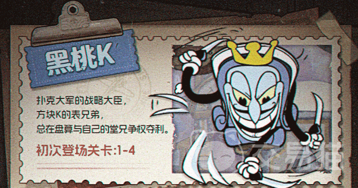 游戏中,黑桃k这个boss出现在前三个关卡,三个关卡都是比较简单的,适合新手来对决,这个黑桃k是和方块k作为表兄弟来出现的,在一到四个关卡当中来登场,其中飞刀风暴作为他的关键词,可以手握兵权,更好的来战斗,满脑子都是争夺霸权,在战斗时会释放扇形的飞刀阵来攻击对方,这个技能会像网一样来锁住大家的走位形式,并且还有一个俯冲的效果。