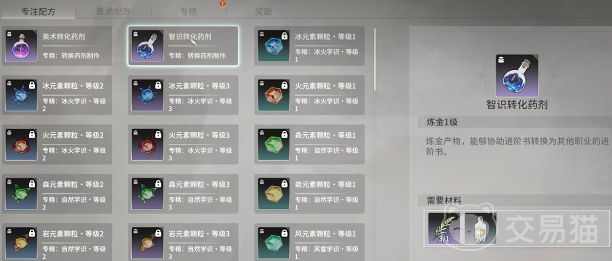 制作智识转化药剂所需的材料分别是蒸馏水和常世草。蒸馏水可以直接从炼金商人那里购买,而常世草则需要通过采集获得。幸运的是,今天的登录礼包中会赠送三个常世草,你可以根据需要自行选择使用。完成药剂制作后,这些药剂是可以交易的,因此在市场上有着较高的需求。如果有时间的话,可以多抢几瓶备用,4500货币就可以购买一瓶,确保不时之需。
