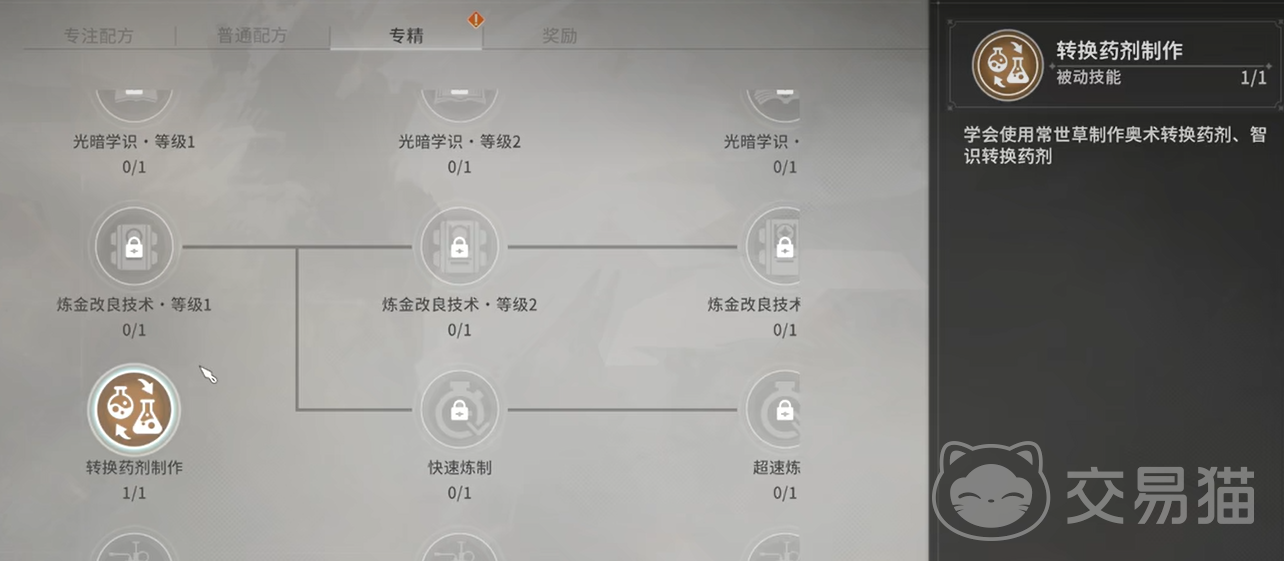 首先,想要使用转换药剂,你需要在专精界面解锁该制作配方。这一步相对简单,只需要消耗少量的专精技能点。如果你的专精点不够,可以点击界面下方的重置按钮进行调整。值得注意的是,每个角色有两次免费的重置机会,但每次重置时,你只能调整三个生活技能的专精,所以要谨慎操作。