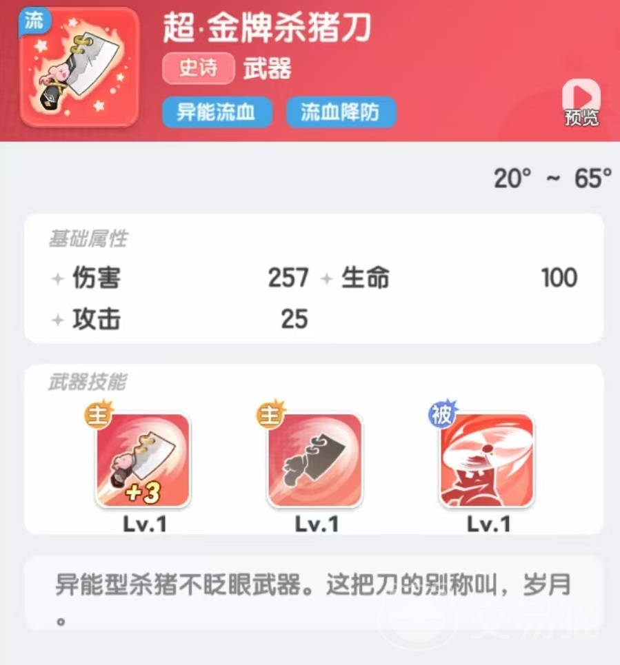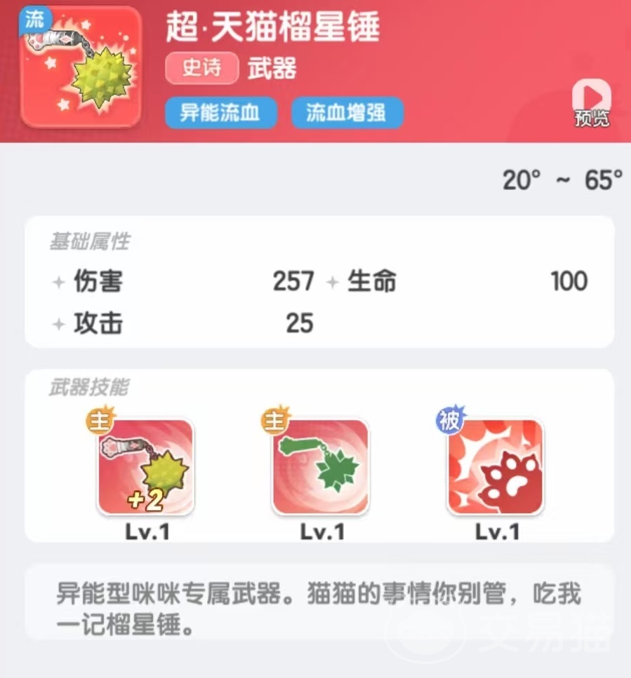 天猫流星锤能发射三颗子弹,如果目标当前的流血层数小于3层,则直接获得2层流血,否则会添加1层流血,被动技能是在使用该武器命中目标时,按照流血层数附加防御降低效果,降低防御之后,自然后续的输出就更加给力。金牌杀猪刀的主动技能射出4颗子弹,使用该武器时流血大幅度增加,使目标受到下2次流血伤害提升,被动效果是每次受到攻击时,都有几率为目标附加1层流血,且刷新回合。惊梦弓的主动效果是发射图2枚分裂子弹,命中后会自动攻击附近的目标,使用该武器时流血提升,有机率附加流血效果。