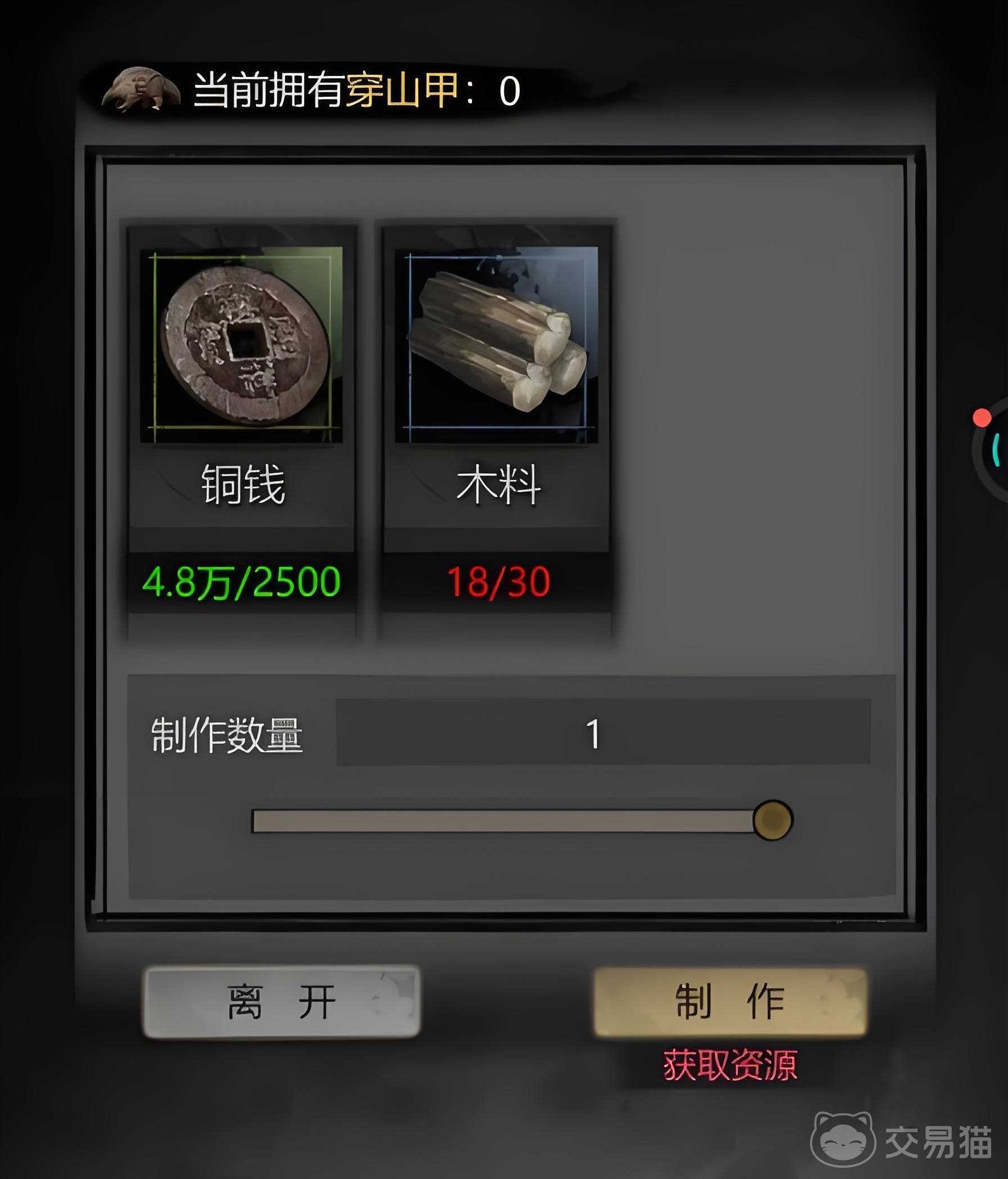想要获得穿山甲的话,只要集齐制作穿山甲的材料就能通过制造获得。制作穿山甲的材料分别是木材和铜钱,铜钱是游戏中通用的货币道具,木材的获得就略有难度,玩家们可以选择通过易物厅直接够买,也可以选择派遣玩法,不过当下玩家获得的角色卡不多可能会不够派遣的人数,可以在派遣时选择1-2人探索比较简单的区域。