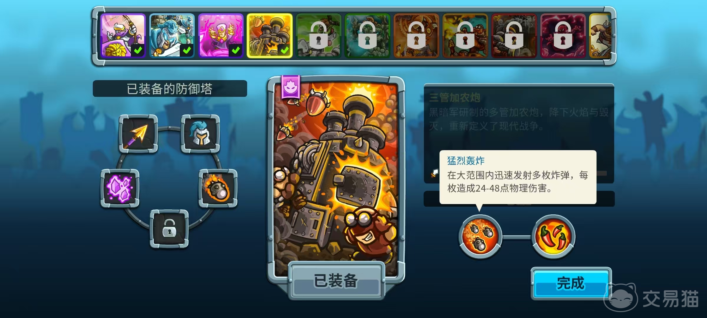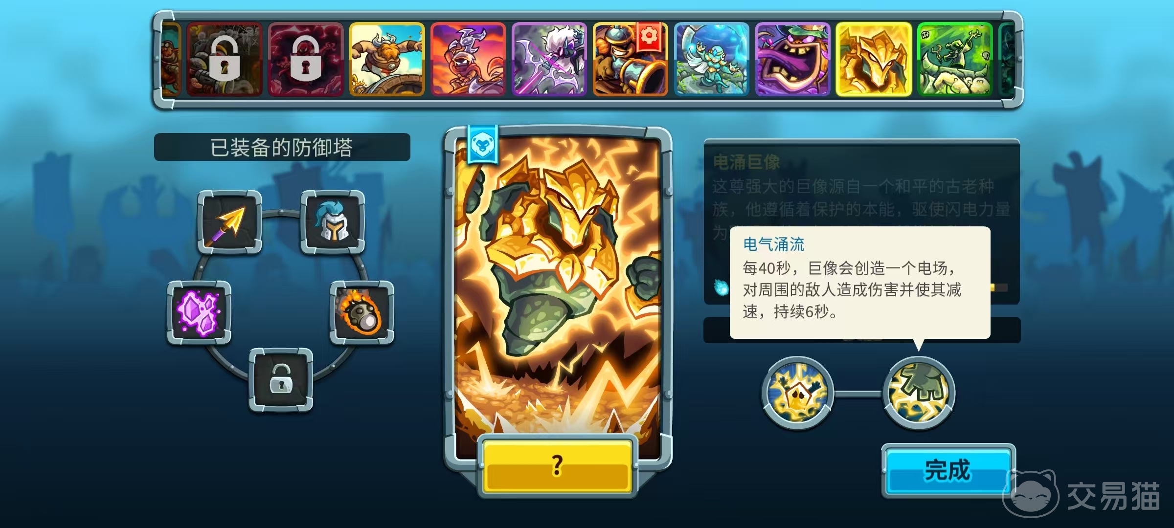 第1个技能可以有效控制敌方单位,为其他防御塔创造输出条件。第2个技能伤害并不高,但是能够大大延缓敌人的推进速度,配合其他防御塔可增加输出时间。这个防御塔的优点就在于控场能力很强,两个技能分别带来了非常优秀的眩晕和减速效果,还有增伤的能力,和其他防御塔能够很好地配合起来。缺点是自身的伤害确实比较低,攻击在敌人身上就如同挠痒一般,面对血量较高的目标时输出能力不足。不过游戏讲究的就是阵容搭配,只要用好电涌巨像的减速和眩晕优势,在关键的位置上建造好,搭配上其他能输出的防御塔就是了。