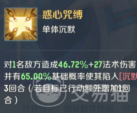 惑心咒缚:主要是针对单体会有46.72%的法术性伤害,还会有65%的几率。可以获得三个回合的沉默效果。是一个主要针对敌方核心的锁喉技能。敌方的强力法师还有关键的治疗,一旦被盯上之后,那技能的释放就会直接被掐断。例如敌方治疗正打算群体回血,那么它就可以直接中断回血,可以给我方创造出更多的优势。在面对高爆发的法师时,沉默也会让他因此哑火,直接可以化解致命的威胁。