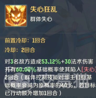失心狂乱:属于一个群体控场的能力,第1个回合可以前置冷却,第2个回合就可以冷却周期。针对三个敌人就会造成法术性伤害,并且还有一个失心控制。有60%的基础概率会让敌方直接进入到混乱的阶段。因此在释放这一个技能后,就可以将对方的阵型打乱,可以拥有一个较好的实用性。