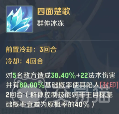 四面楚歌:属于一个大范围的控场技能,在团队作战的过程中,这个技能就可以覆盖敌方多个人群。而且还会有输出,有治疗有辅助,无论是防守反击还是攻坚团战都能迅速地冻结敌方的行动。可以给整个团队创造出更加强悍的输出,甚至还可以决定整个团队的胜负。
