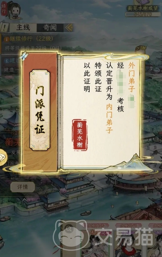 刚进入蘅芜水榭时玩家会获得外门弟子的身份,只有达成所有的晋升目标后,才能晋升为内门弟子。目前蘅芜水榭的晋升要求比较简单,玩家先去不断地完成门派给予的任务用来提升威望,然后寻找一名NPC争取将自己与她的亲密度刷到能随性的地步,这样就能与对方一起去找花铃儿完成晋升挑战。同时,各位记得带上一些能禁疗的武学招式,来破解晋升boss的机制。待玩家们完成晋升挑战后,花铃儿就会通过玩家的晋升考核,并会发放成为内门的通过给玩家。