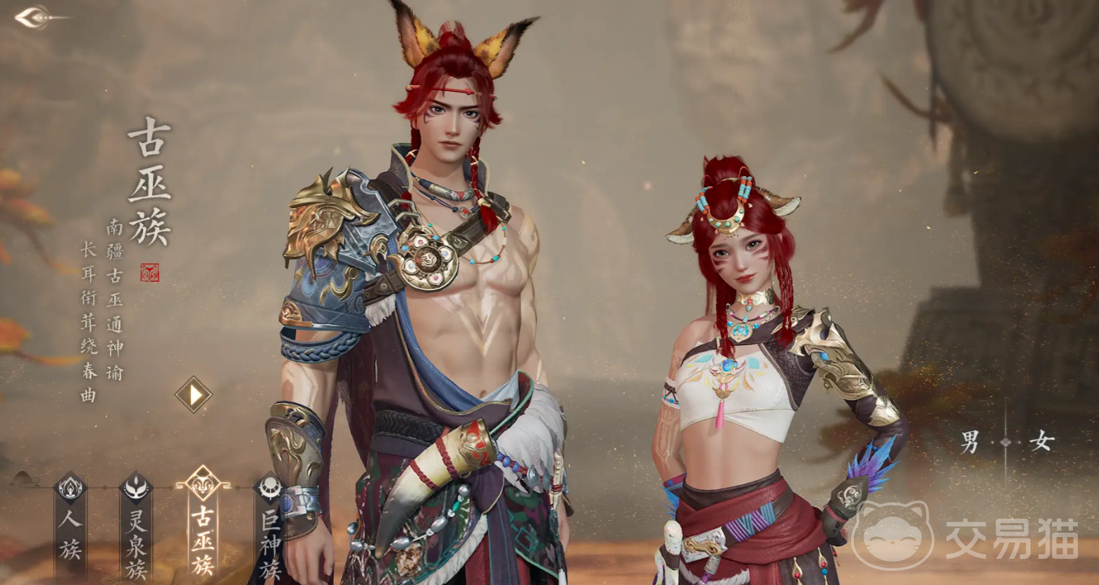 古巫族生活在瘴气缭绕的南疆之地,他们时代守护土地,是自然的精灵,他们的外貌为兽耳长尾,特殊的能力是幻化为各种灵兽,靠着矫健的身形,在山川之间之间探索,解控时会唤醒体内沉睡的灵兽力量,挣脱一切的束缚。