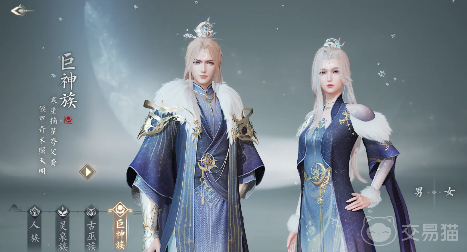 巨神族是夸父的血脉,他们生活在北境,是星辰的宠儿以及大地的守护者,他们的身材非常高大威猛,是与生俱来的战士,精通占星术和偃甲机关,在夜幕奖励的时候,他们能召唤出星辰阵法,让自己漂浮于空中,展现神族的风采。