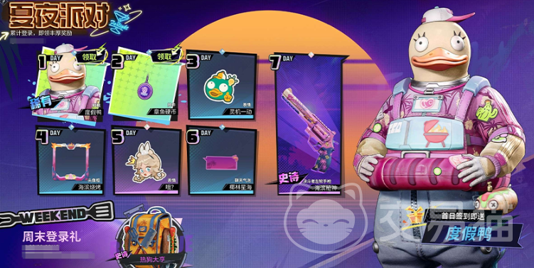 除了这些以外,游戏里面还有着开服的7天签到,本次的签到取名夏日派对,玩家们每一日登陆都可以获取到很不错的奖励,在第一天登陆的时候还可以获取到鸭鸭稀有皮肤度假鸭,7天还有着左轮史诗皮肤海滨枪神。