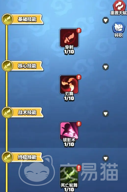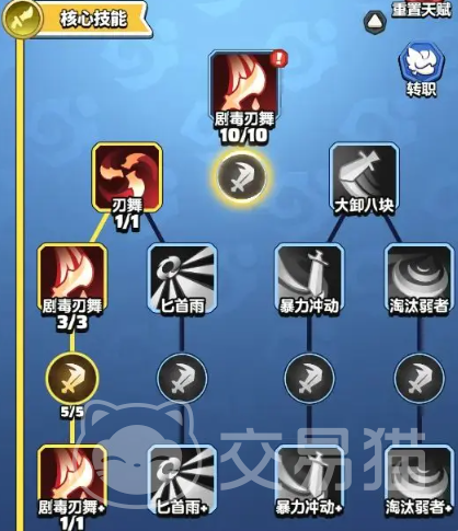 首先大家总共会有23点的天赋点,在第一阶段可以先消耗4天赋点,将4各技能全部解锁,点到第一层效果,这样才能顺利打输出,到第二阶段可以去消耗9天赋点,将“刃舞”、“大卸八块”这两个核心技点出第三层效果。