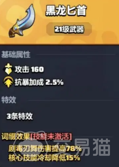 最后由于我们在加点方面是围绕核心技来打输出的,因此装备上要优先去穿戴对核心技有增益的套装,如此才能让收益最大化,比方说核心直接增伤、核心的冷却剑帝,或者核心伤害提升都非常不错,像下图中的黑龙匕首,就是带有让剧毒刃伤害提升78%,核心技冷却降低15%的效果,对于这一套技能加点而言非常适配。
