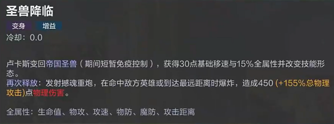 当卢卡斯的3技能“圣兽降临”激活时,他将变身为帝国圣兽,这一形态下,他的控制免疫、移速和全属性将得到显著提升。而更重要的是,他的技能会获得强化,让卢卡斯在变身后能够打出更高的伤害,并且在使用1技能和2技能时,效果更加强力。如果你对敌人造成了足够的压制,3技能释放后,卢卡斯还能放出“撼魂重炮”,这道炮弹在命中敌人或飞行至最远距离时会引发爆炸,带来强烈的物理伤害。可以说,这是卢卡斯的大招亮点,威力巨大,足以让敌人感受到他无与伦比的统治力。