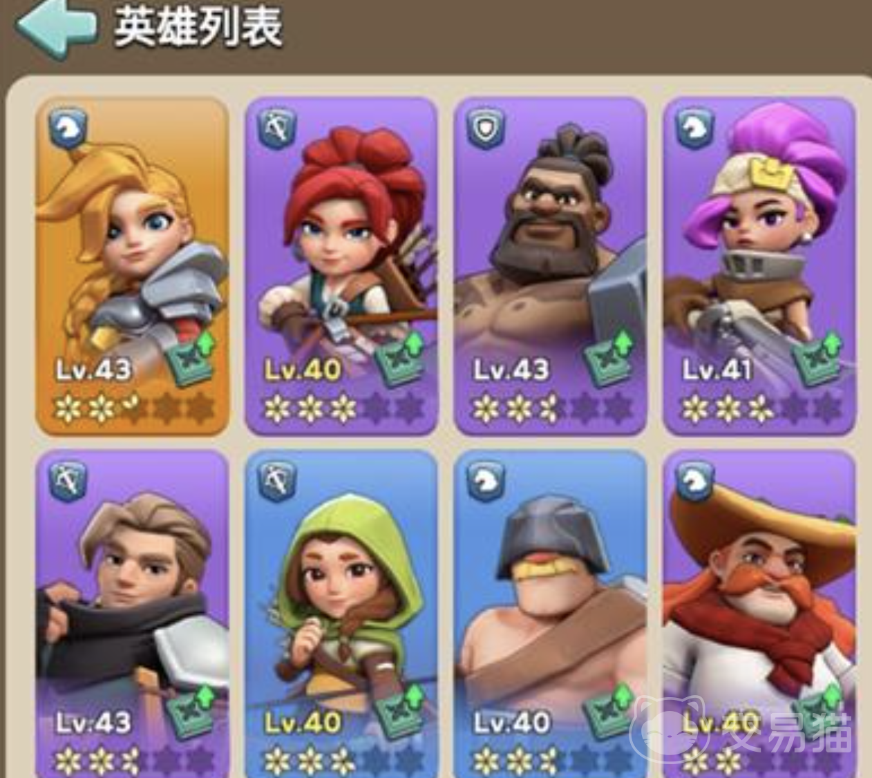 《奔奔王国》的英雄分为4橙(SSR)、5紫(SR)、4蓝(R)三个品质层级,但不同品级属性差距微小,真正决定强弱的是专属武器养成与职业定位。所有骑士类英雄可通过任务免费获取,步兵类需付费或参与活动解锁,弓手类则主要为付费获取。每位橙色英雄拥有专属武器,强化后能同时提升自身与队伍属性,这是拉开角色差距的关键。