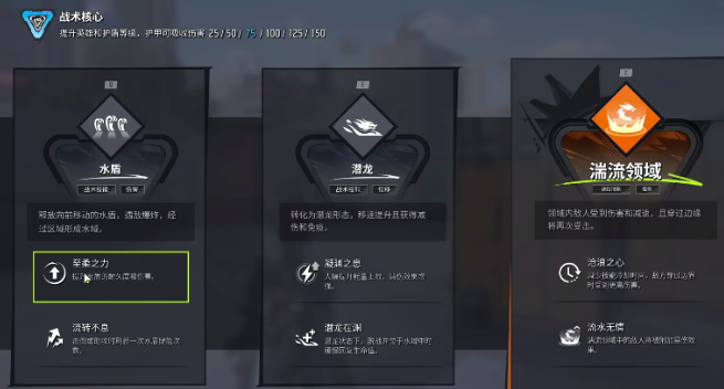 先来说第一技能是水盾,玩家在释放该技能后可直接向前释放水盾,并在其前行轨迹上留下水域,无论是队友还是自身进入该水域线范围内,都可以进入到加速状态。而且在潜龙的形态下,通过释放该技能还可以附带震撼效果,打出增强水盾。当赋予天赋一至柔之力后,能够快速提升水分的耐久性。解锁天赋二,流转不息时,玩家进入到击倒或助攻状态下,就能够刷新一次水盾的储能次数。