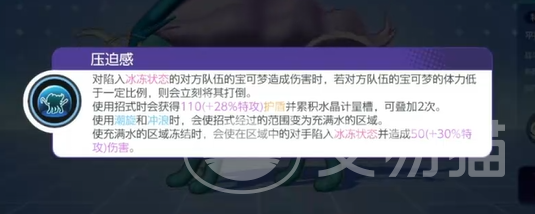 至于水君的特性“压迫感”,它更是增添了一层致命的威胁。只要敌方宝可梦被冰冻并且其血量低于一定比例,水君就能立即将其击倒,简直是一把无形的剑,时刻悬挂在敌人头上。配合技能的使用,水君还能获得护盾,增强生存能力,十分适合站在战斗的最前线。追击敌人,还是保护队友,水君的特性都能为团队提供很大的帮助。