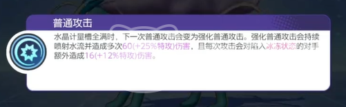 水君的普通攻击看似简单,却充满了巧妙的设计。当它的水晶计量槽积满时,下一次普通攻击将会变成强化普攻,这时水君会开始喷射出水流,造成多次伤害,且如果对方被冰冻状态控制住,那就更有意思了,每一击都会额外附加伤害。这意味着,掌握了水君的强化普攻,你将能够在对战中持续压制敌人,并且一举扭转局势。强化普攻和冰冻效果的结合使水君成为了对敌方强力输出的威胁,尤其是在中期或团战时。