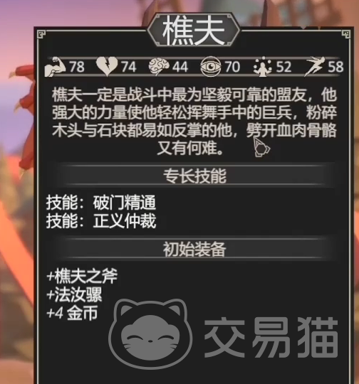 樵夫:花费18个点数就可以解锁。这就是一个半肉半输出的代表力量相对比较基础,在众多的角色中还是比较有优势性的。生命数值也很不错,不过速度相对比较慢一些,属于一个偏向于输出的角色。会有强大的力量,可以轻松的挥舞手中的巨兵,无论是石头还是骨骼,全部都可以劈开。会有两个专场技能,全部都是比较实用的,例如会有一个破门精通就可以迅速的提高成功率。初始装备也有多个一开始可以使用斧头,但是到了后期可能就没有太多的作用。