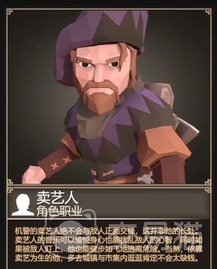 卖艺人:玩家在游戏中任意一局模式之后,只需要花费12个点数就可以解锁。这就是一个辅助类型的角色,虽然要比吟游诗人逊色一些,但是在辅助的团队中就可以担任二把手。如果队伍中没有吟游诗人,那么不如就选择这一个。一般的情况下都不会和敌人正面的对战,音乐可以愉悦人的神经,同样也会扰人心智,一旦被敌人盯上之后,那还是可以迅速的逃离。从属性上来看才能是比较高的,力量也会比较优秀,一般的情况下大概只需要一个就可以逃走。