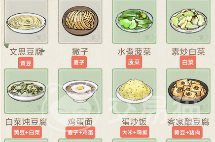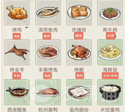 其他的选择有素炒白菜,白菜炖豆腐,或者是客家酿豆腐等等。这些在游戏中出现的几率都是比较高的。除此之外还有水煮菠菜,开水白菜,还有蛋炒饭。肉类菜品方面有清蒸鱼,肉有熟牛肉,还有烤鸡。除了这些之外,就有手撕烤兔以及炸猪排。海鲜饭就受到了不少人的关注,是将大米和虾肉放在一起,从甜品类方面来看是很不错的。