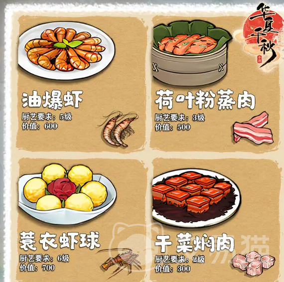 经典菜肴:油爆虾厨艺5级,价值600。荷叶粉蒸肉价值500。干菜焖肉厨艺二级价值300。这些对于厨艺就会有明确的要求,价值也是有所区别的,另外还有八宝童鸡价格为900。此外大家可以选择的还有虾仁猪心汤、葱爆牛肉以及干锅土豆虾,品种还是比较丰富的。这些都是经典的菜肴,那除此之外还会有一些选择,例如主食或者是小吃。