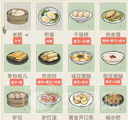 米糕就是大米,千层糕是麦子加上白糖。咸豆腐脑是黄豆,加上卤水,黄金开口笑是麦子加上牛肉。肉夹馍是猪肉,加麦子加卤水。还有煎蛋虾饺以及驴打滚等一系列的菜样。