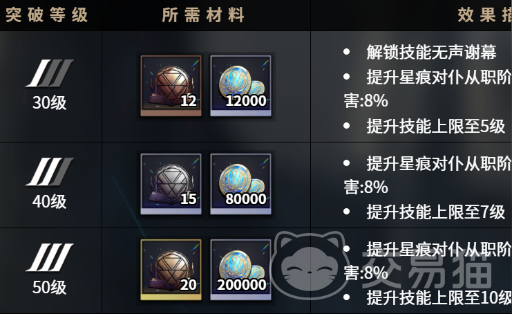 安娜的等级需要在30级40级以及50级的时候进行突破,不同的等级突破所需要的材料数量不同、材料类型不同,30级突破需要用到12枚普通的人子忆章以及12000本勒,40级突破需要用到精致人子忆章15枚、80000本勒,50级突破需要用到20枚豪华人子忆章以及200000本勒。