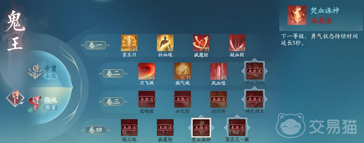在天书加点方面,鬼王有两个不同的方向,分别是纯坦克和输出类型。先来看一下纯坦克,在天书加点上,最关键的就是自身生存以及团队增益。破阵子、玄冥胄、生血魂、护心斩这几个一定要点。破阵子可以使得锁魂追命、凌霄碎魂等技能,在勇气状态下有额外的防御加成,加强生存。玄冥胄的效果是开启冥王降世后恢复自身血量并持续恢复血量。生血魂的效果提高血气上限,增加能量上限。护心斩的效果是裂地斩能获得减伤以及额外的防御加成,是很好用的减伤类技能。