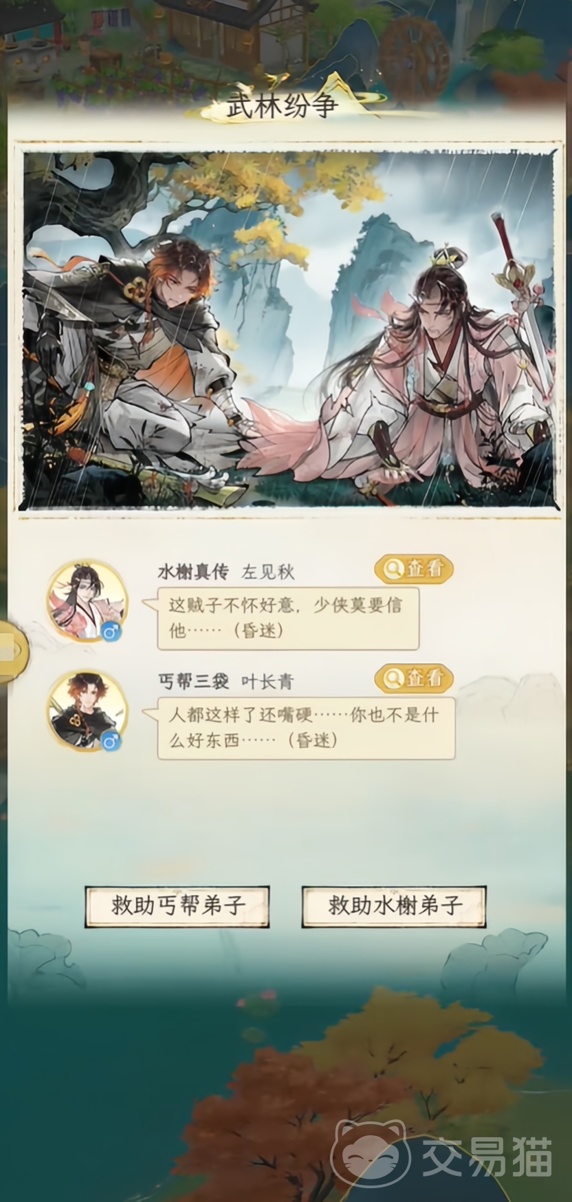 这两位角色,分别是丐帮的叶长青与水榭的左见秋。叶长青是丐帮的三袋弟子,行事仗义,个性豪爽,代表的是丐帮这个朴实却极具实战价值的门派;而左见秋则是水榭的真传弟子,气质清冷、沉稳内敛,象征着水榭那种内修精进、潜力深厚的修行路线。当我们选择救下其中一人时,将会获得对方所在宗门的邀请函,这张邀请函可以让我们在前期无需提升宗门亲密度,直接跳过入门流程,正式加入该宗门。