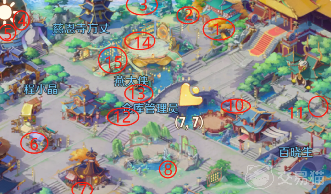 往建筑的后方走,能看到一片湖,我们绕着湖的边上一直走会发现一个集运葫芦,顺着找到的方向继续向着右走,能看到一个宝箱,我们向着百晓生的方向前进,一直直走在前方又能发现一个宝箱,剩下还有很多要搜寻的物品,大家可以跟着下图来依次去找。