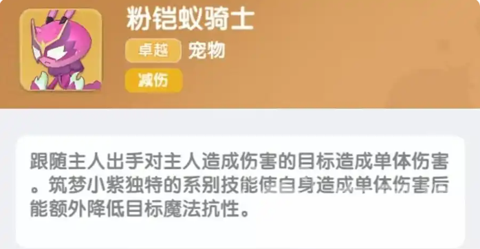 减伤型的宠物推荐粉铠蚁骑士,在跟随主人攻击后,独特的机制能降低敌方额外的魔法抗性,它在场时,还能帮助角色分摊伤害,提高防御能力。最后推荐蓝莓警长,能对敌方随机2个宠物造成伤害,优先攻击角色打出伤害的敌方宠物,还能让它对其中一个单位的攻击伤害提高。