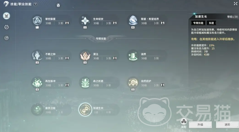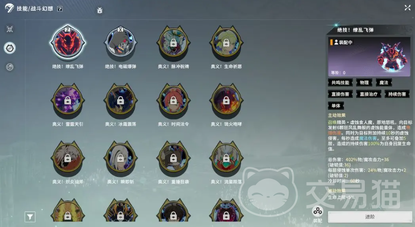 其中升级操作主要是提升技能的固定数值部分,让每次释放都能造成更稳定的伤害或产生更强的效果,进阶则是着重提高技能的倍率,此外部分增益类技能还会带来效果量的显著提升或者持续时间的延长,在这里要特别提醒各位玩家,本职技能的评分仅基于大家当前实际装备的技能进行计算,其中基本攻击、特殊攻击以及终极技能属于固定携带项目,除此之外大家还拥有自主选择的权利,可以从众多选项中挑选四个选配的专精技能进行搭配,通过对这七个技能的精心升级与进阶,就可以提升技能模块的战力分数。