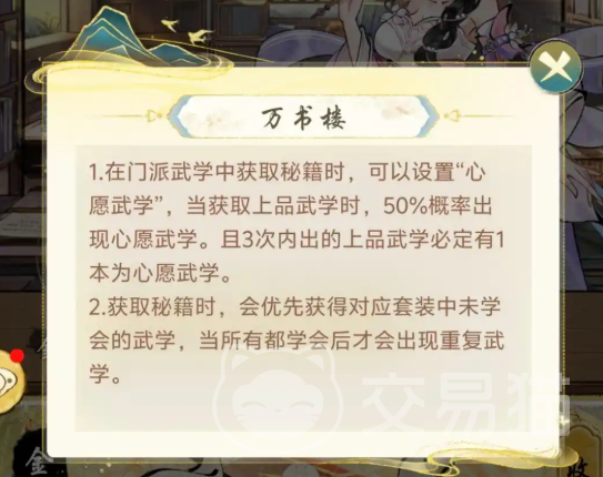 利用三级前免费重置规则,就可以选择去反复的刷新。经验数值在满了之后就可以选择立即重置,然后就可以直接转移,到了后期就可以迅速的升级,减少不必要的资源浪费。在门派武学中,玩家也可以去设置心愿武学。可以有机会获取上品武学,同时也有50%的机会可以出现心愿武学。大概每三次就能获得一本心愿武学。在获取密集时就会优先的获取对应的武学,主要是在对应套装中还没有学会的,在全部学会之后,那么自然就会出现重复的内容,这也是大家所需要了解的。