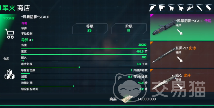 在选择具体型号时,务必关注导弹的速度参数与攻击范围指标,比如备受推崇的鹰12A导弹,这个导弹的打击能力绝对会让大家印象深刻,尤其是背身攻击时的高额伤害输出,并且一次齐射可发射两颗导弹,还有海科导弹,其创新设计的可变弹道让敌人难以捉摸飞行轨迹,在对空作战中能起到出色的干扰作用,也可以用来打乱敌方部署。