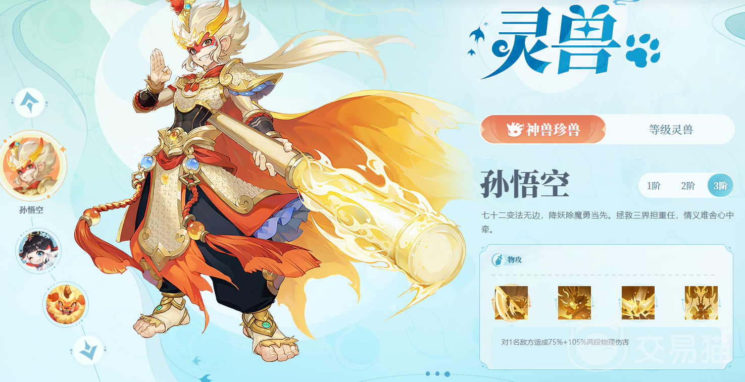 “孙悟空“无疑是这类神兽中最具代表性的存在。不仅拥有经典的角色形象,其战斗能力更是令人瞩目。它的招牌技能"棒打乾坤"可以对单个敌人造成两段高额物理伤害,在精准打击敌方核心单位方面表现出色。更为难得的是,孙悟空还具备优秀的生存能力,其被动技能"圣佛状态"在气血降至零时会触发重生效果,并提升物理和法术闪避率,这种攻守兼备的特性使其成为许多玩家的首选 。在实战中,孙悟空特别适合需要速战速决的战斗场景,尤其在PVP对战中能够快速突破敌方防线 。
