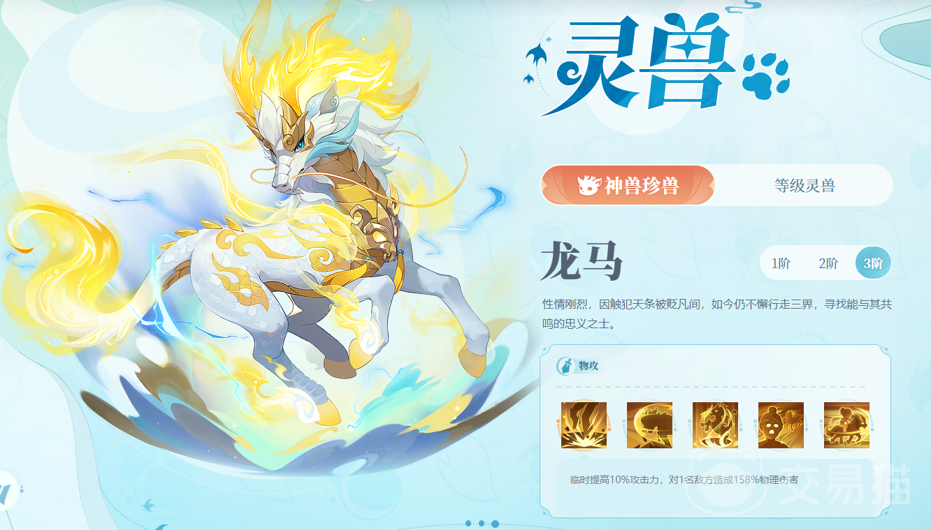 作为新服限定神兽,同样属于物理爆发型的佼佼者。这只需要通过开服庆典活动购买的稀有神兽,凭借其独特的技能机制在物理输出领域占据重要地位。龙马的"龙吟劈岳"技能可临时提升自身攻击力并对单体目标造成高倍率物理伤害;"龙腾四海"则有机会在击杀目标后触发追击效果;而被动技能"万马奔腾"作为大招,能对至多7位敌人造成高额伤害,展现了其群体输出的潜力。值得注意的是,龙马的培养需要重点投入暴击相关属性,高级物爆和高级爆伤技能书是其核心配置,配合四技能的暴击追击效果,可产生质变级的输出提升。