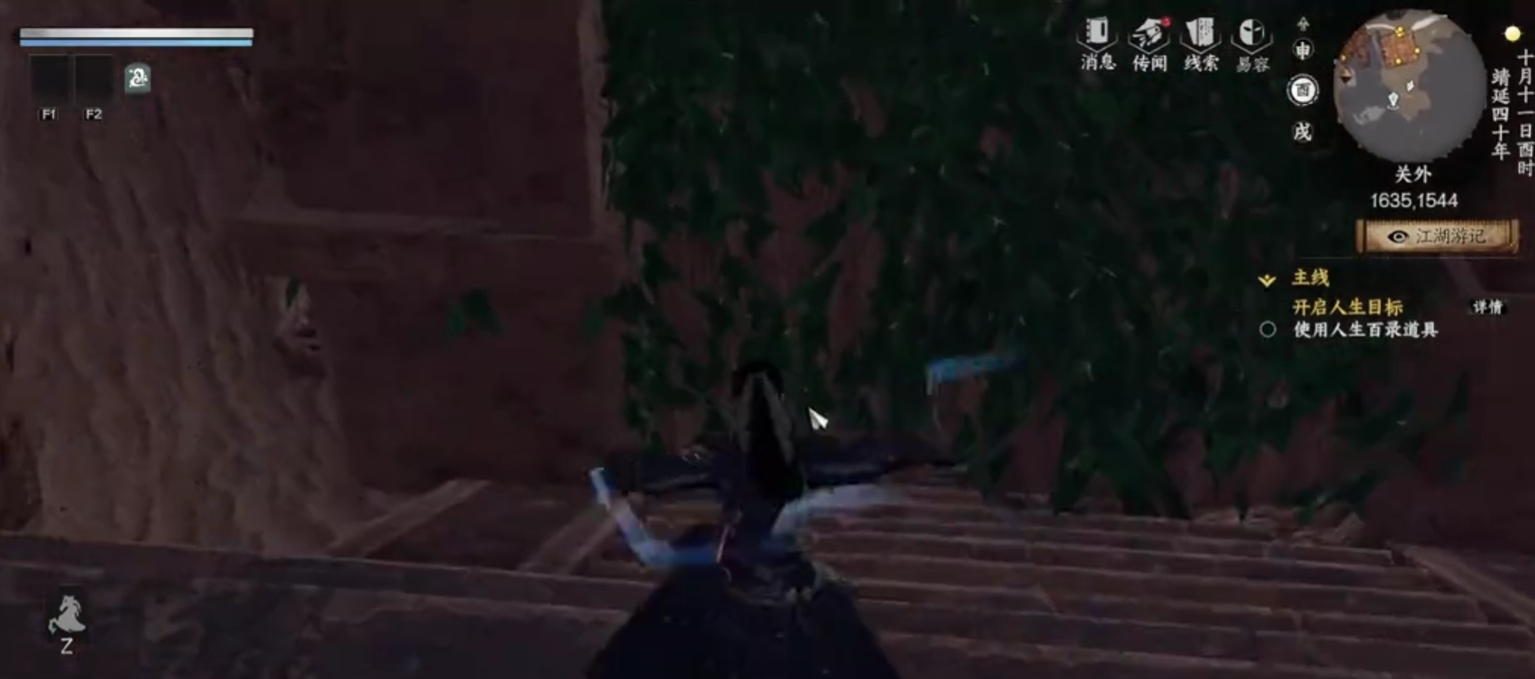 第二种方法的出现主要是因为正门无法开启,和第一种一样,玩家们需要到达关外,尤其是需要到关外的具体位置[1629,1547]处,当到达这个位置之后玩家们会发现一个三角凹陷的的一人坑,玩家们只需要在坑内四处试探,当玩家们到达某一个点之后会直接从坑中坠落,到达下方的一个阶梯位置,当玩家们发现有阶梯并且周围还有一个由绿叶遮掩的洞口时,这样就已经算是成功到达昭月地宫了,玩家们从洞口进入就可以开始探索昭月地宫啦。