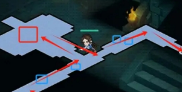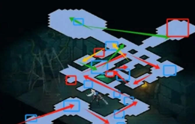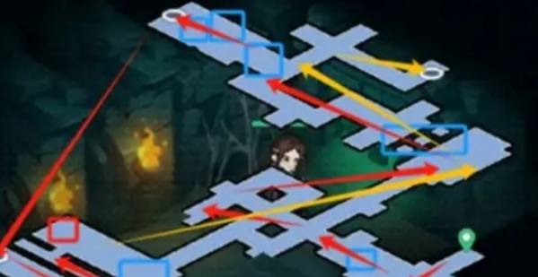 来到隐藏空间,这里线路较为线性,只需要按照红色和黄色箭头标记移动即可。唯一的难点,是在右侧路线的末端,你需要找到并拾取钥匙。得到钥匙后,就能打开通往下一层的门。