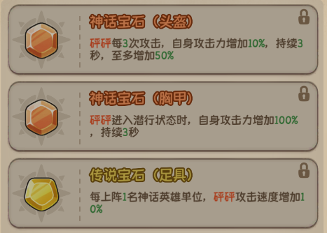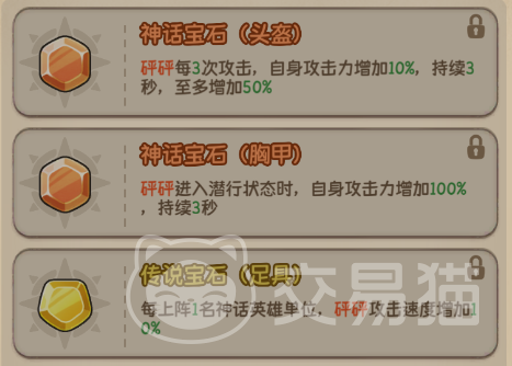 至于增加攻速的传说宝石,虽然对于攻击间隔本就很短的砰砰来说看似有些多余,但它增幅的数值却非常可观,是只要每上阵一个神话英雄,就能增加10%攻速,在后期大成召唤出多个砰砰的情况下它的实际增幅作用会非常可观。