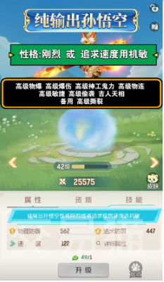 纯输出孙悟空在性格方面可以选择刚烈,有效提升10%的暴击率,降低5%的防御力,可以追求极限输出。机敏可以提升10%的速度,可以选择优先的出手。在加点方面可以选择全武力能够最大化伤害,当然也可以选择四力一敏,不仅会有速度,而且还可以直接抢占先机。在核心技能书方面,高级物爆、高级爆伤、高级物连、高级神功,都是可以选择的,能有效强化输出的核心。高级敏捷就能迅速的提升15%的速度,让孙悟空在战斗的过程中就可以优先出手,轻松就能秒杀敌方的脆皮。高级偷袭在攻击时就可以直接忽视目标10%的物理性防御,可以进一步的提升伤害的穿透性。