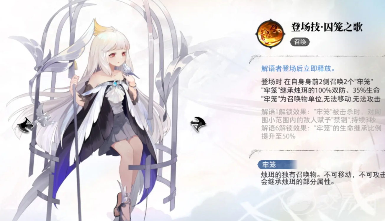 烛珥同样是五星,她在守护职业属于比较特别的召唤流,召唤出来的囚笼能帮助抵抗大量的伤害,生存能力很强,她的“囚笼之歌”会在登场时,在自己的身前两侧召唤出2个囚笼,囚笼会继承烛珥100%双防,以及35%生命,强化后囚笼在被击杀后会对周围小范围内的敌人赋予禁锢3秒,她的“囚笼之鸟”会在场上存在牢笼的时候,为它们回复一定的生命值,若场上没有,还会在自己的身前召唤出1个。