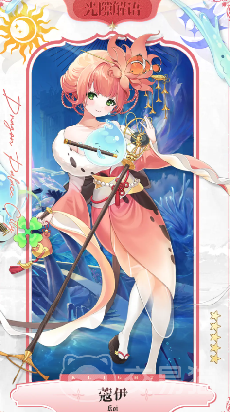 蔻伊是5星,她的普攻会打出水弹对目标造成魔法伤害,并让处于共生状态下生命最低的队友获得治疗效果,她的“礼赞传唱”会在登场时选择一定范围内距离自身最近的一个队友,让其一起进入共生状态中,释放时若我方场上没有其他处于共生的队友,则会在范围内选择队友进入共生,她的“乙姬颂歌”会让自身和所有共生队友以自身为中心,让方位内队友获得护盾5秒。