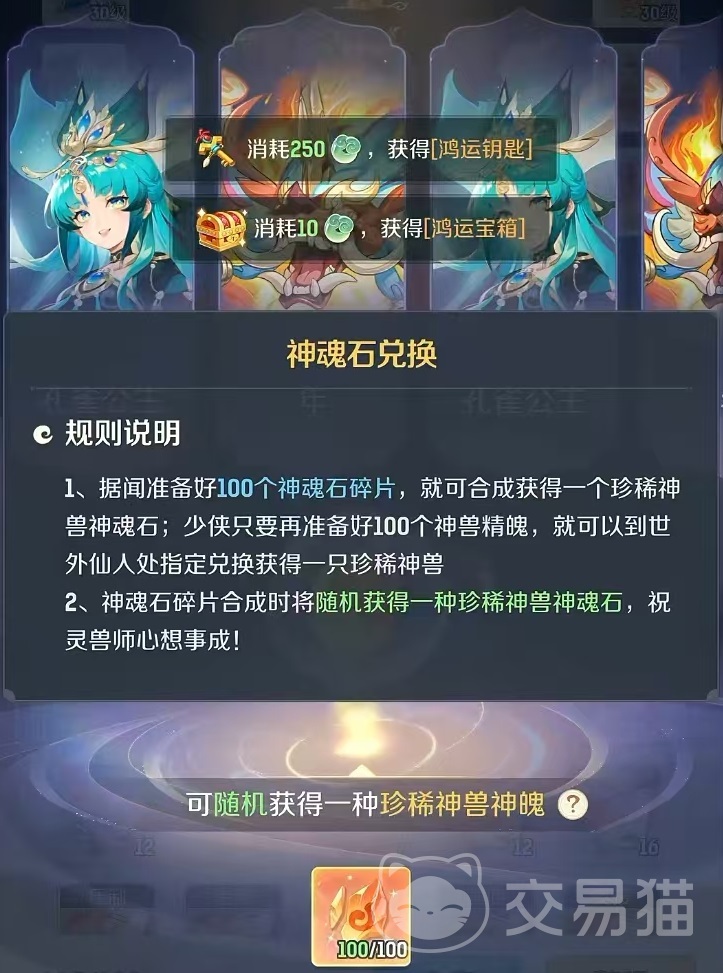 玩家在游戏中可以通过准备好100个神魂石碎片,合成珍稀神兽神魂石,然后再准备好100个神兽精魄,就可以兑换得到一只珍稀神兽了。在神魂石碎片合成时,将随机获得一种珍稀神兽神魂石,这也是获得神兽最主要的手段。另外还可以通过充值的方式来获得部分神兽,总之神兽的获取有一定的难度,但实力也非常强悍。