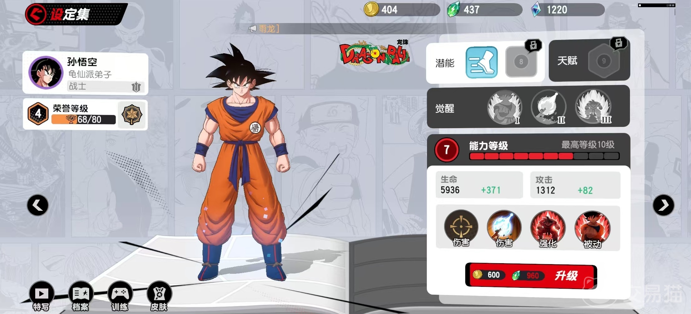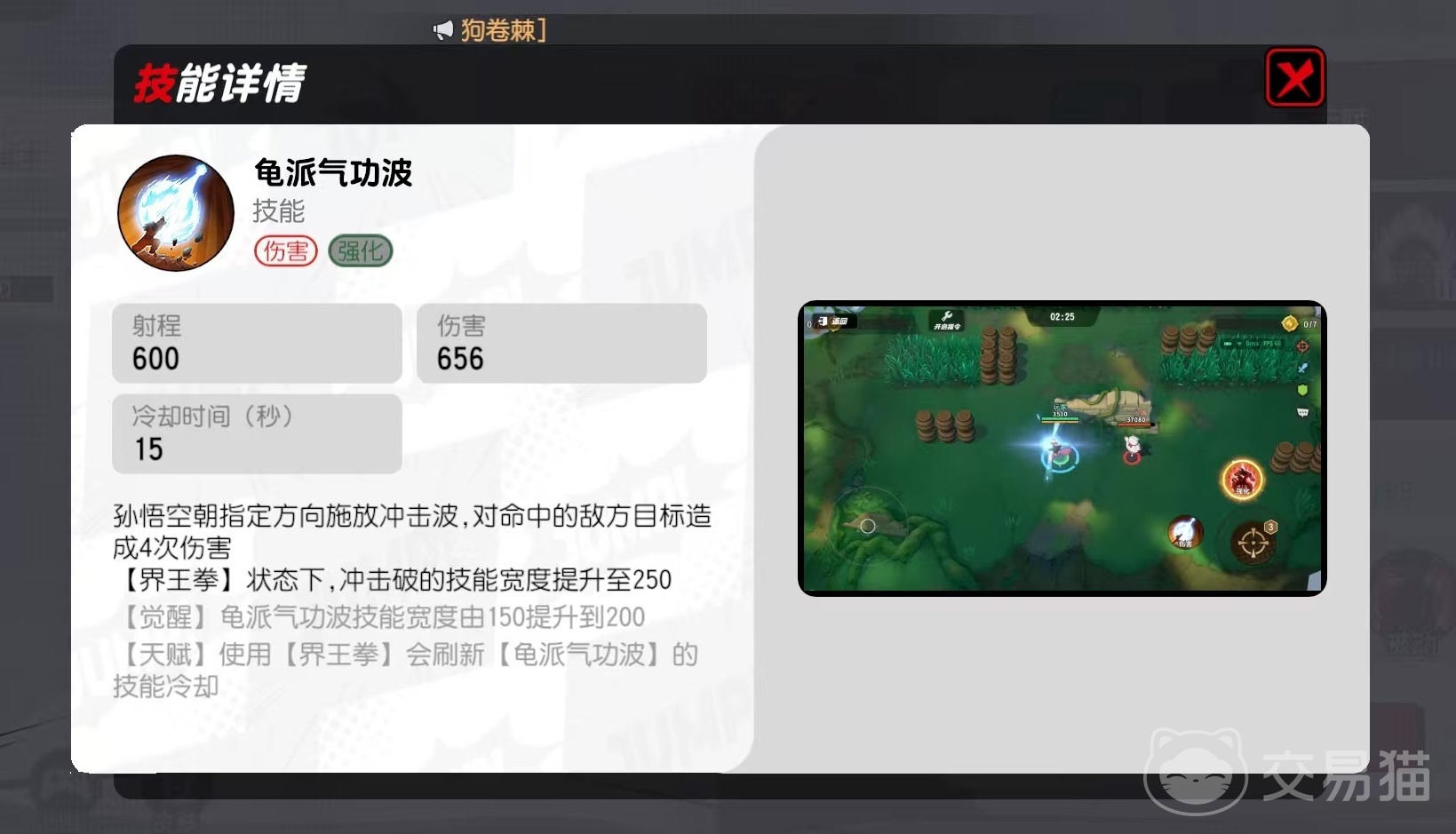 在游戏中,孙悟空是属于龟仙派弟子,定位是战士。普攻武道拳法,有伤害有位移,利用武道拳法向前移动攻击对手,每次攻击会消耗一点能量,命中敌方目标造成伤害。如果是在界王拳的状态下,则普攻移动距离提升。一技能龟派气功波,朝指定方向释放冲击波,命中敌方目标后造成4次伤害,在界王拳的状态下冲击波的宽度提升。